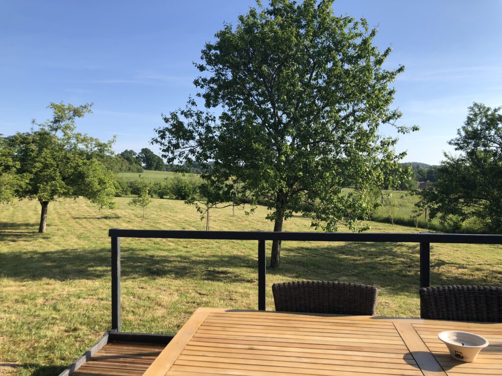 - Grote omheinde tuin met fruit- en notenbomen, meerdere zithoekjes en uitzicht over het groen.